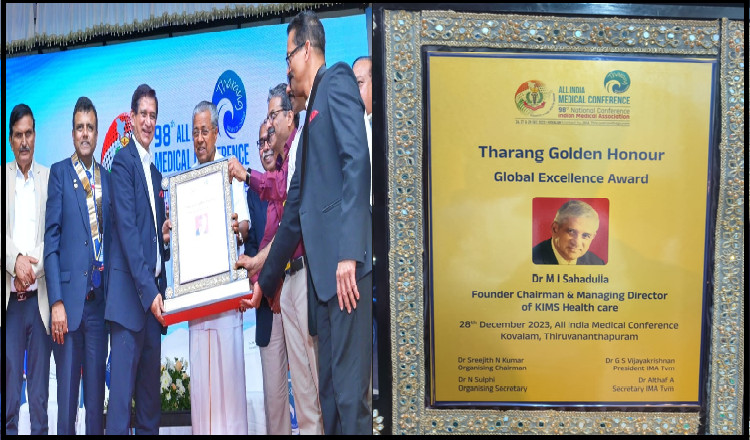 Dr M I Sahadulla, Group Chairman and Managing Director KIMSHEALTH receiving IMA Tharang Golden Global Excellence Award from Chief Minister of Kerala Shri Pinarayi Vijayan